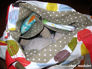 ça va faire deja 6 mois depuis j'ai eu ma premier Marina dans mes mains et je n'ai pas cru arriver à coudre un doudou ou encore un sac ........aujourd'hui je viens vous présenter mon premier sac à gros points ( tissus chez Mondial Tissus ) . J'ai voulu faire le messenger bag de Cath Kidston, ses sacs sont une merveille., mais finallement mon sac a deux anses. Il est volumineux, lavable ... et surtout a moi.
